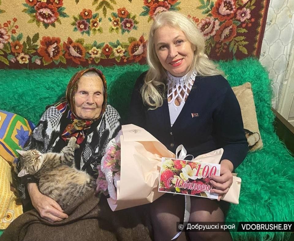 У соты дзень нараджэння ў доме гаспадыні на вуліцы Крывенчанкі былі рады гасцям. Павіншаваць імянінніцу прыехалі начальнік упраўлення па працы, занятасці і сацыяльнай абароне райвыканкама Ганна Харыбіна, дырэктар цэнтра сацыяльнага абслугоўвання насельніцтва Алена Алейнікава з калегамі, прадстаўнік раённай ветэранскай арганізацыі Уладзімір Царык. У руках гасцей – прыгожы букет, яркая паштоўка і падарунак.