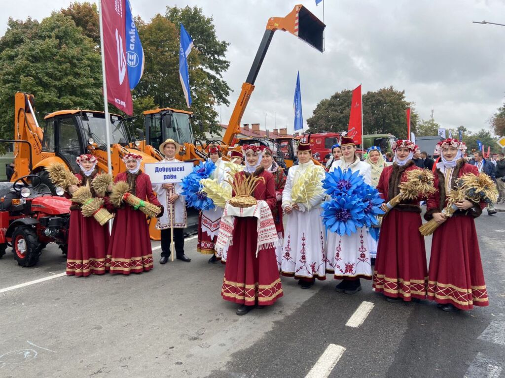 Ярко, празднично, позитивно: делегация Добрушского района готовится к торжественному шествию в Лельчицах. В нарядной колонне — передовики жатвы и другие представители отрасли, работники культуры.