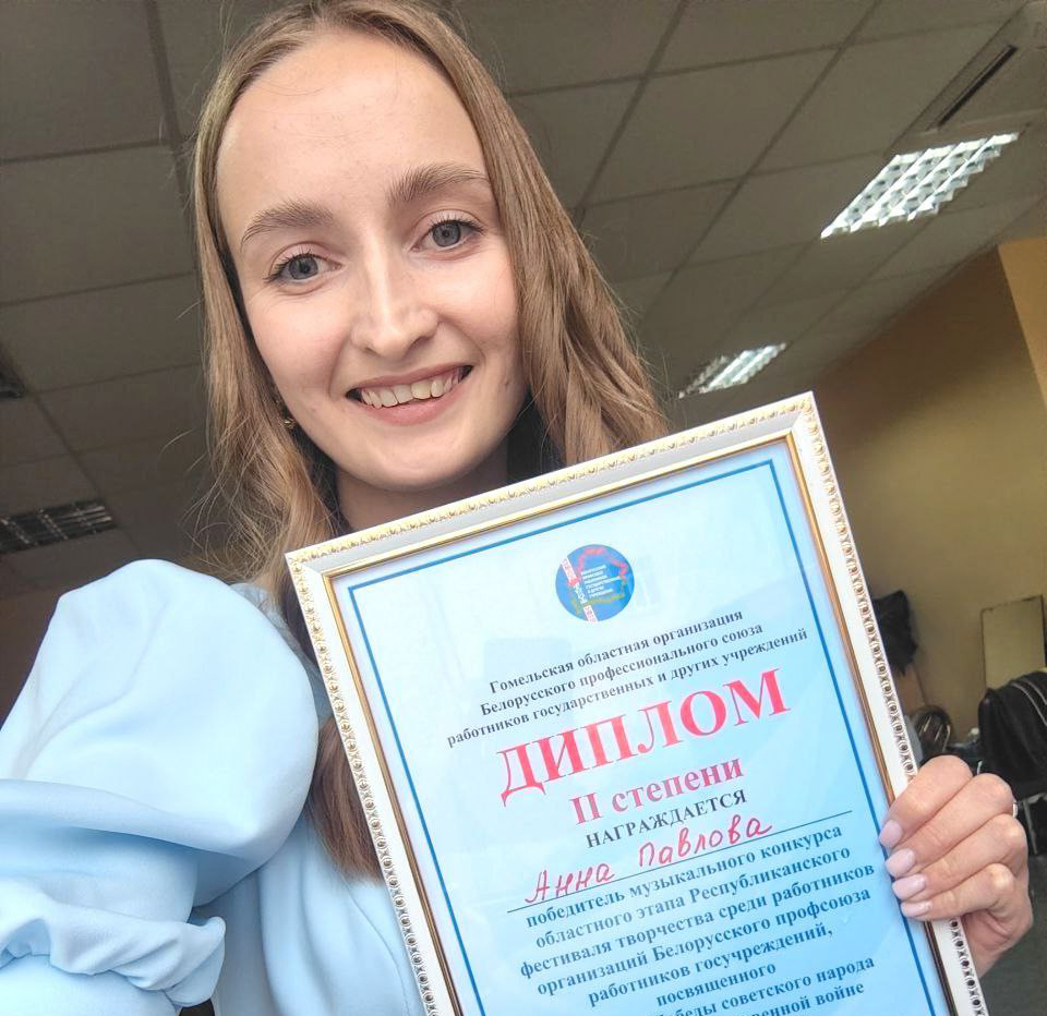 Ведущий референт отдела принудительного исполнения Добрушского района Анна Павлова заняла второе место в областном фестивале творчества среди сотрудников Белорусского профсоюза работников государственных и других учреждений.
