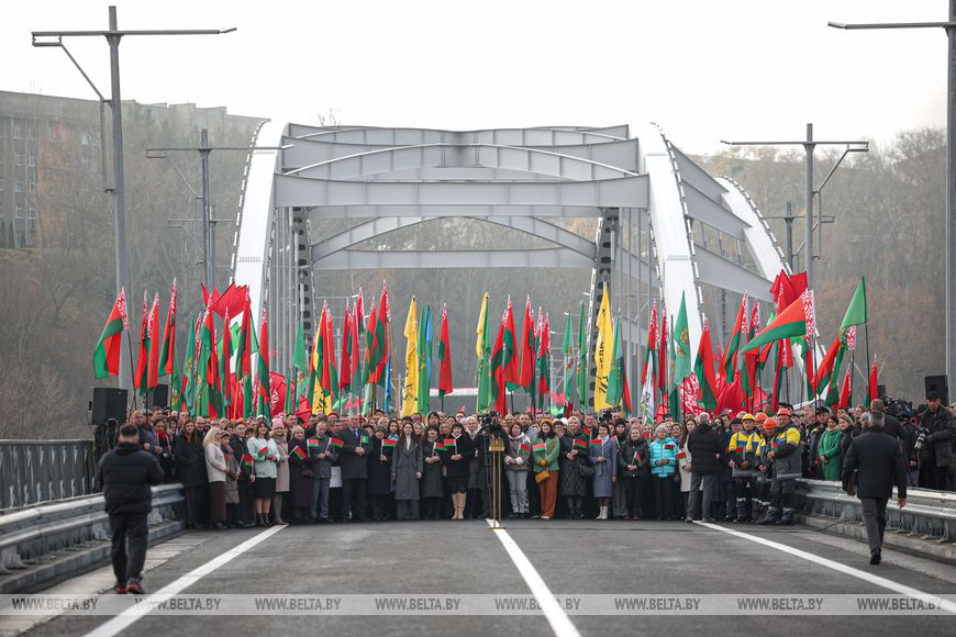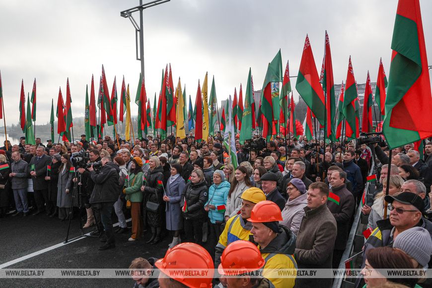 Глава государства в торжественной обстановке перерезал символическую красную ленточку. На церемонию были приглашены представители трудовых коллективов дорожных организаций, участвовавших в строительстве моста, жители Мозырского района. По сложившейся традиции ко Дню Октябрьской революции людям преподносят подарки — значимые, масштабные объекты, и обновленный мост — один из них.