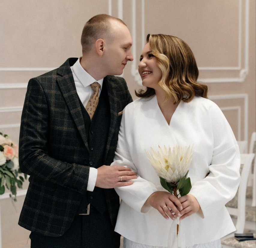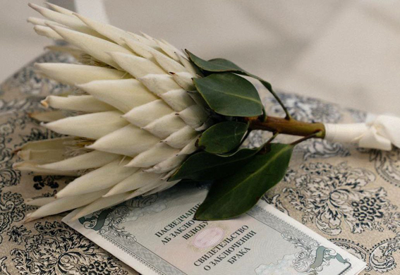 О счастливых молодоженах мы сначала узнали из информации загса. Его работникам эта пара запомнилась особенно. Например, тем, что на скромную церемонию регистрации брака невеста пришла в красивом наряде и с цветком королевской белой протеи вместо свадебного букета.