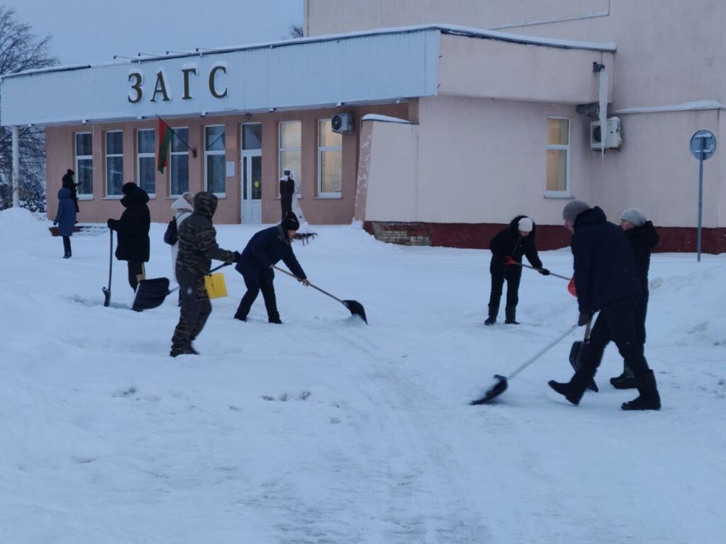 Несколько десятков работников райисполкома и «Добрушского коммунальника» очищают территории возле здания загса и службы «одно окно», других посещаемых жителями объектов.