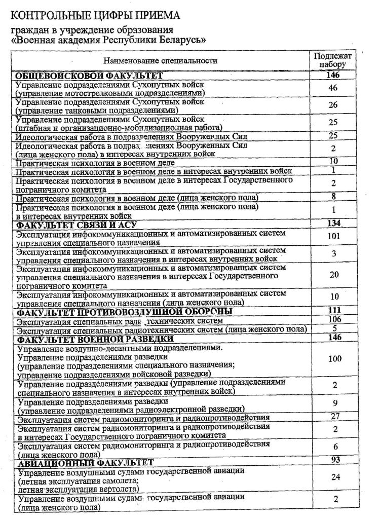 Военная академия является ведущим учебным, методическим и научным центром в системе военного образования. Контрольные цифры приема в учебное заведение представлены на нашем сайте. Желающим обучаться в УО «Военная академия Республики Беларусь» обращаться в военный комиссариат Добрушского и Ветковского районов.