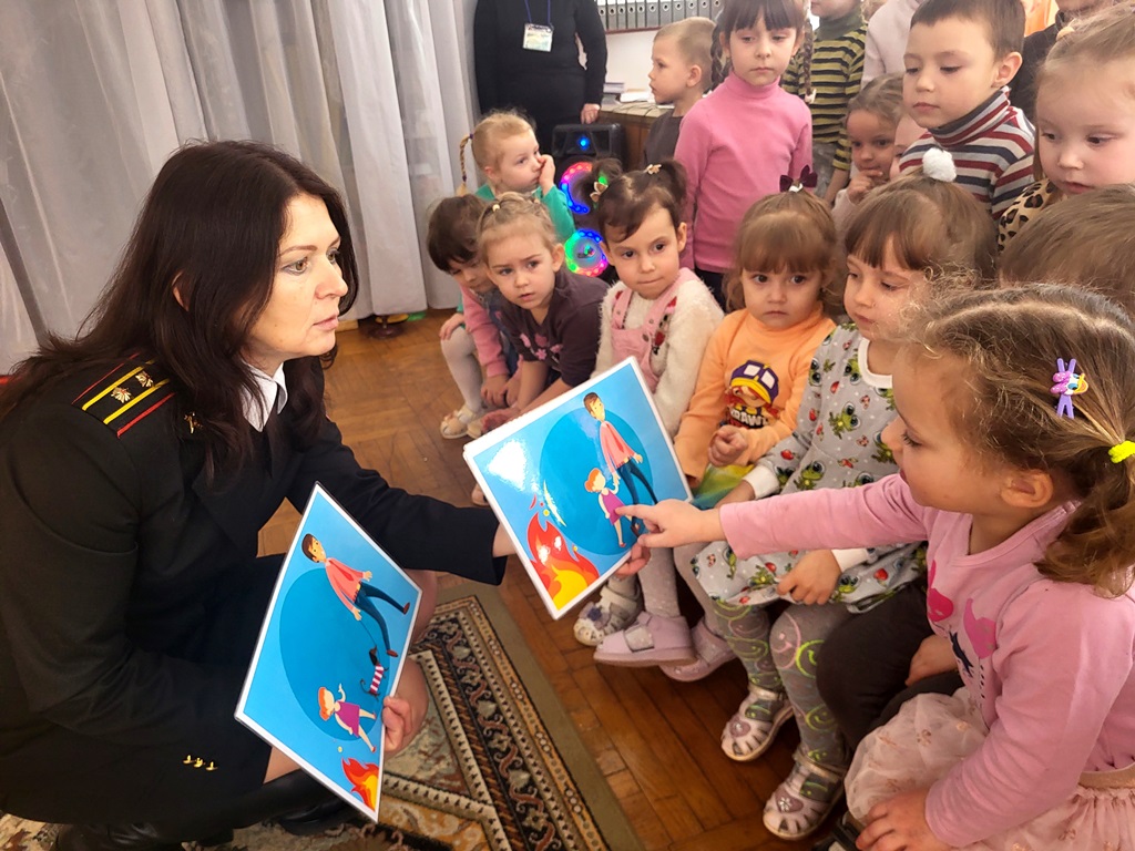 – Здравствуйте, ребята! Сегодня у вас в гостях служба МЧС. А чем занимается служба МЧС? – задает вопрос воспитанникам инспектор МЧС.