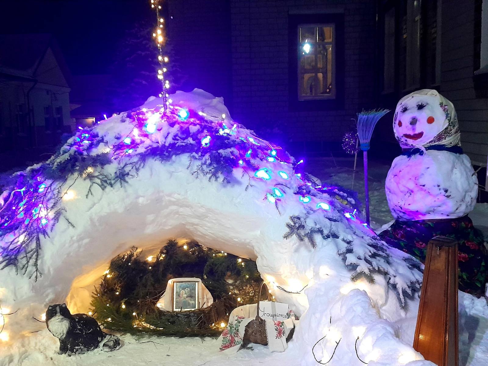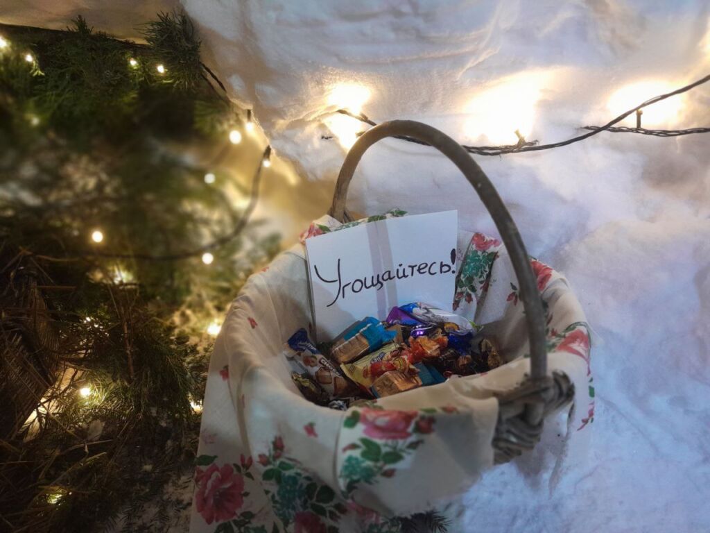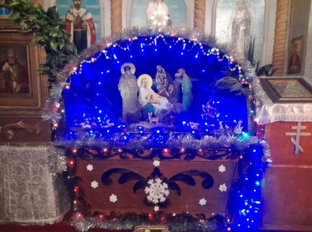 В Рождественский сочельник многочисленные жители и гости города собрались в храме святителя Николая Чудотворца. Волшебная атмосфера встречала прихожан еще во дворе. Здесь сияющий вертеп в пещере из снега, с фигуркой кота у входа и корзиной со сладким угощением.