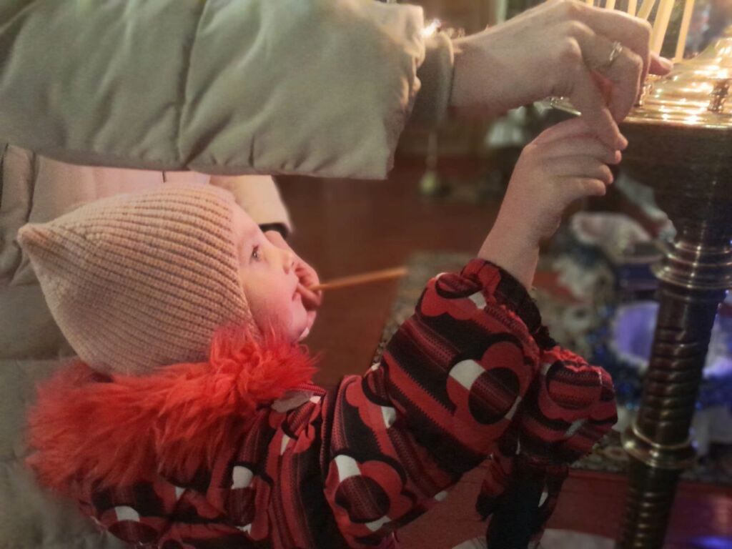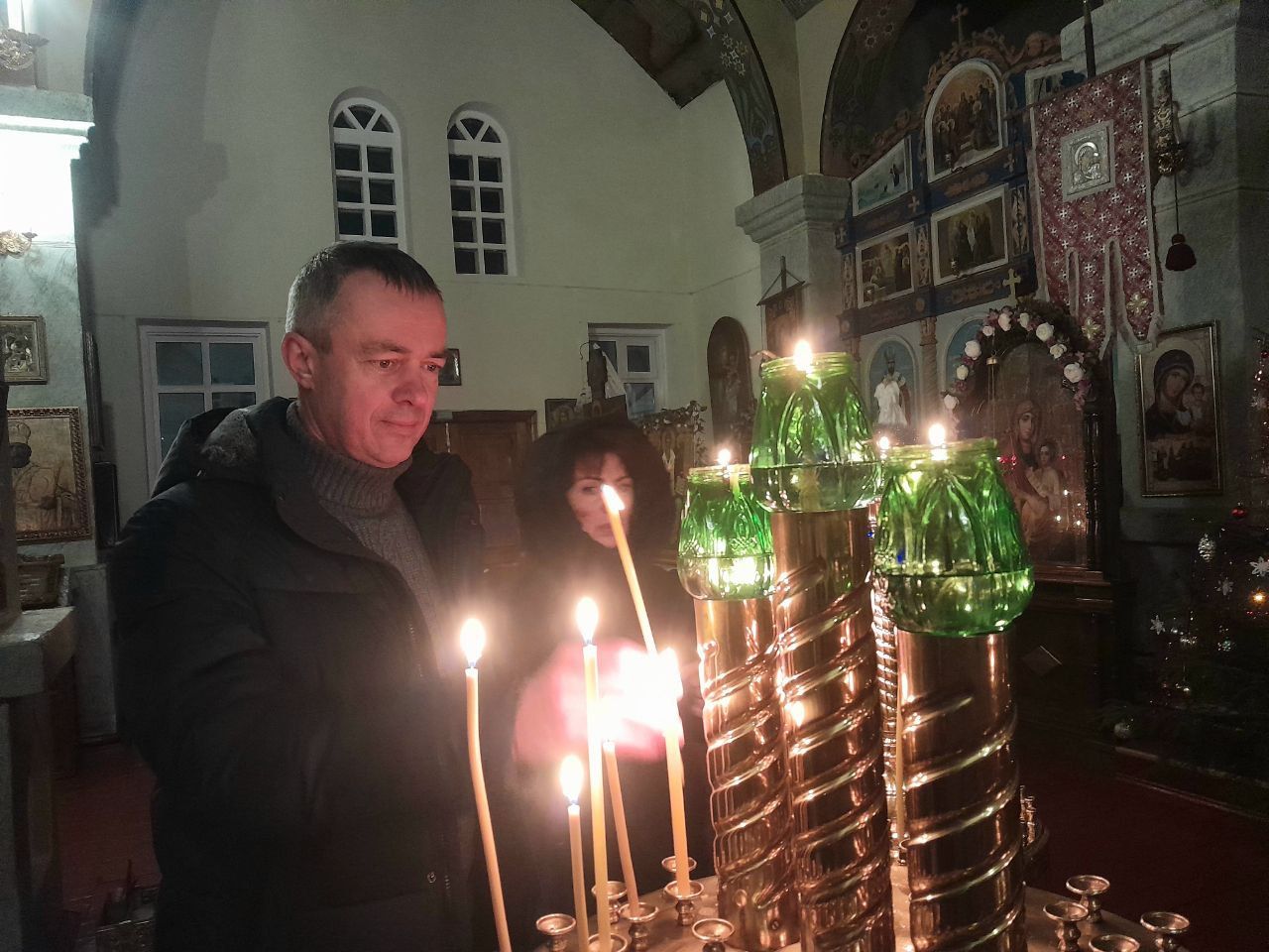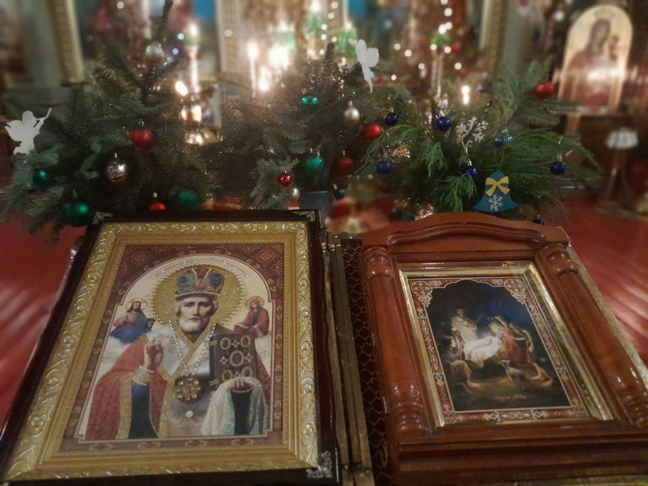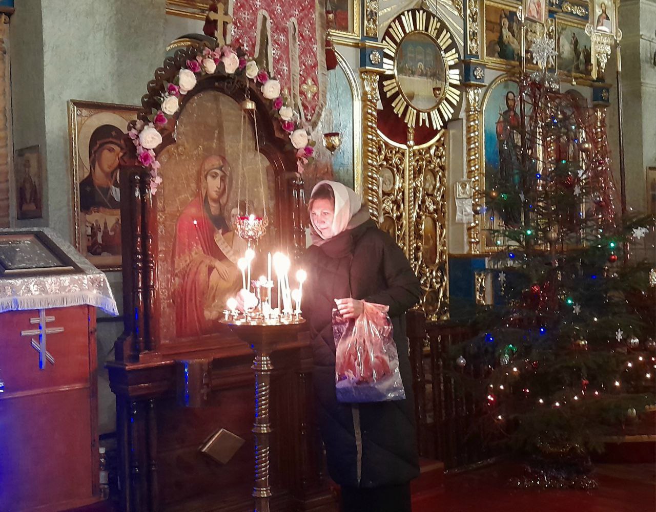 Внутри – атмосфера торжества и строгости. Горящие лампадки перед изображениями ликов святых, нарядные елочки  у алтаря. В ожидании начала Всенощного бдения верующие зажигали свечи, перед иконами возносили благодарственные молитвы Господу.
