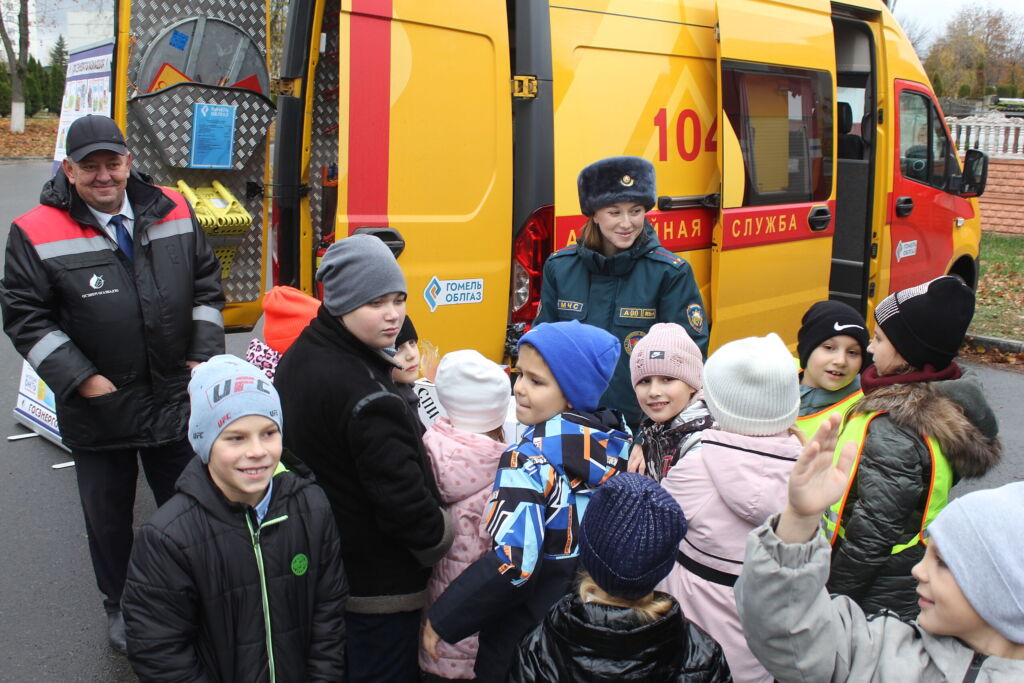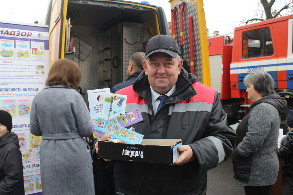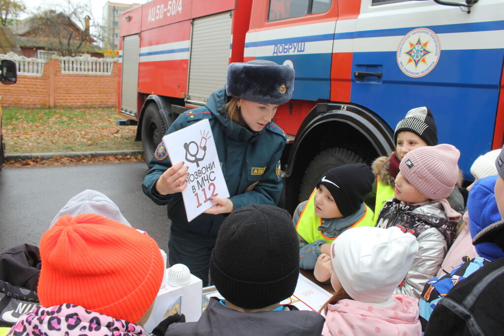 Организаторы и участники акции решили охватить не только взрослую категорию, но и юных горожан. Учащихся школ Добруша сегодня пригласили на мероприятие на свежем воздухе. Осуществить задумку в других условиях было бы невозможно. К месту проведения прибыла пожарно-спасательная и аварийная техника, а возле машин установили презентационные столы и стенды, на которых оперативно появились наглядная информация, игрушечные пособия для обучения правилам безопасности. Кстати, спасатели сделали их, в основном, своими руками. Неудивительно, что детям, которые вскоре наполнили площадку веселыми голосами, хотелось все рассмотреть и потрогать.