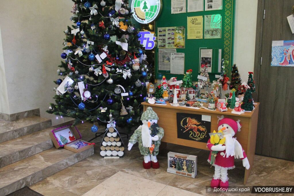 Сколько здесь собрано работ, сказать сложно. Они не трлько на столах, подоконнике, на полу, но и на большой сверкающей елке. Вклад в ее оформление внесли многие работники. На ярлычках самодельных игрушек – название работы, информация об авторе.