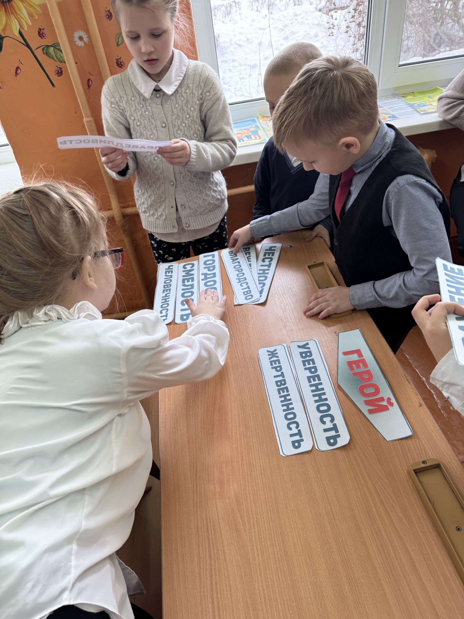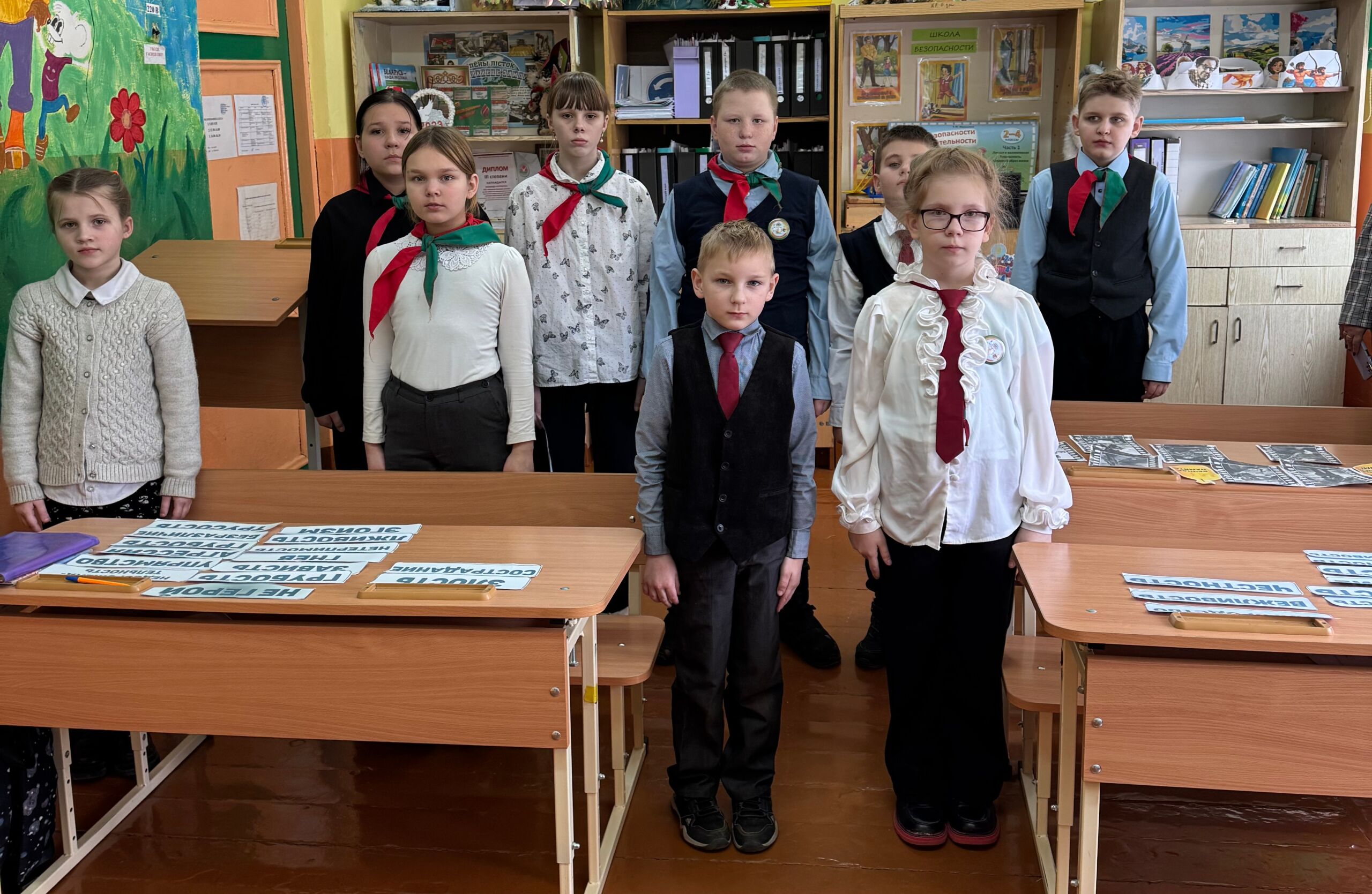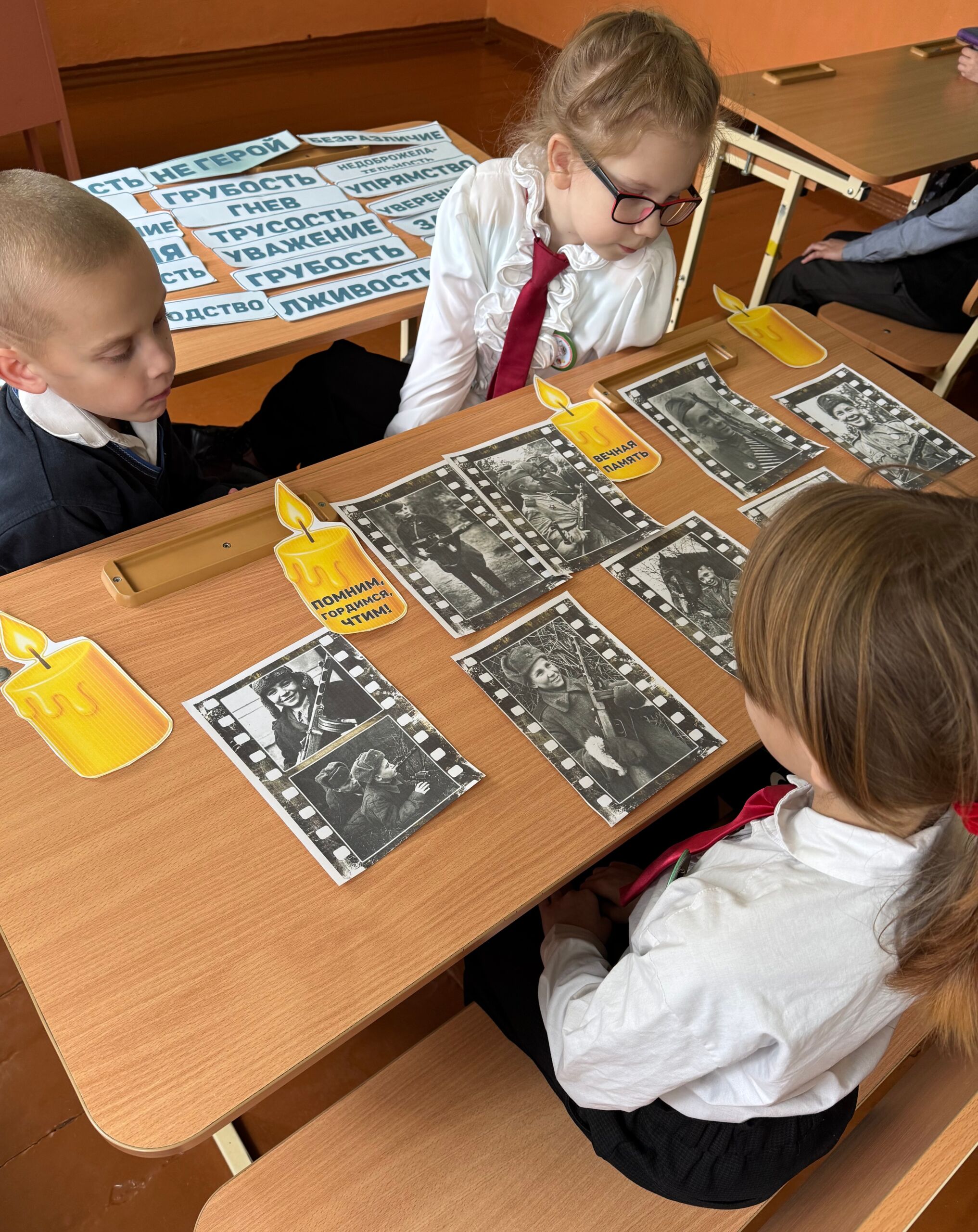 Минутой молчания школьники почтили память всех ребят, чье детство было опалено войной. В завершение урока ребята создали коллективный коллаж «Мир, который они отстояли». Он символизирует хрупкость мира и цену, которую за него заплатили.